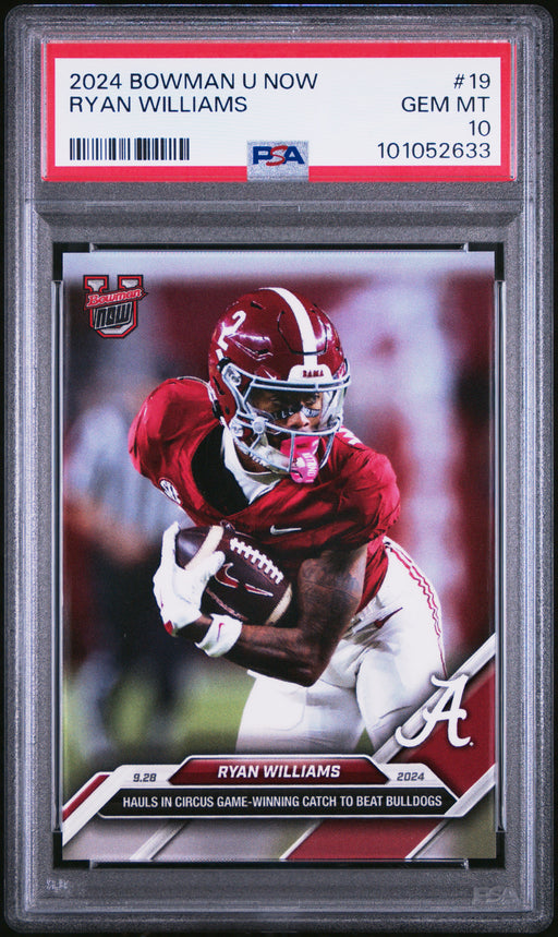 Gorgeous, PSA-graded 2024 Bowman University Now trading card of Ryan Williams of the Alabama Crimson Tide. This is a PSA GEM-MT 10 (Gem Mint) colle...