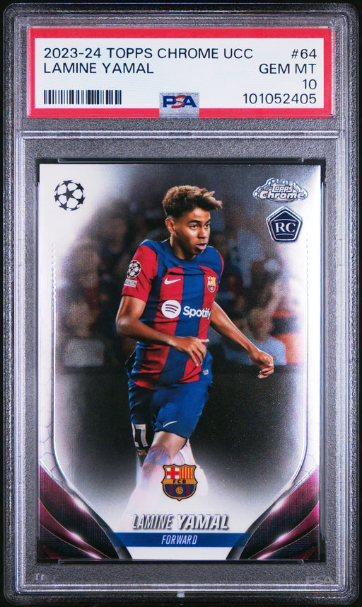 Gorgeous, PSA-graded 2024 Topps Chrome trading card of Lamine Yamal of the Barcelona. This is a PSA GEM-MT 10 (Gem Mint) collectible card. This car...