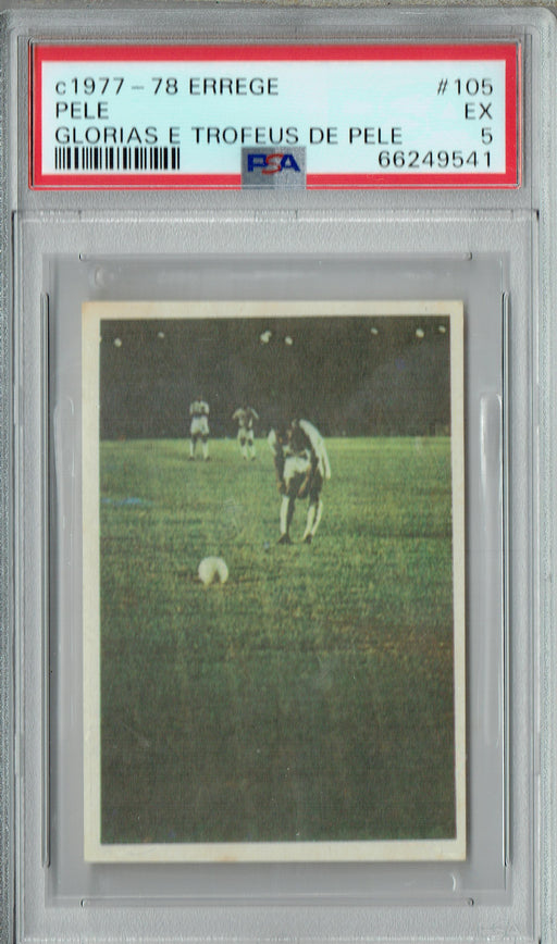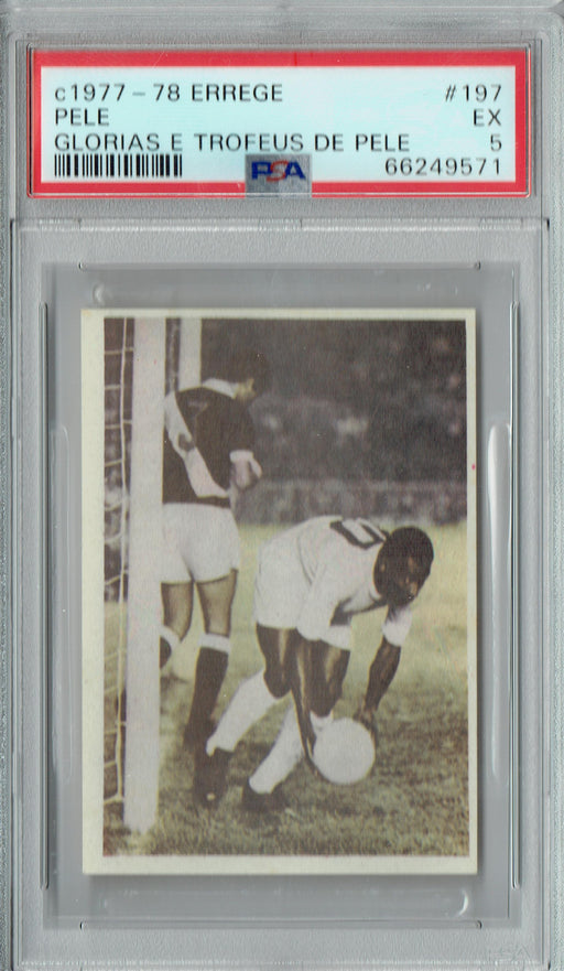 Gorgeous, PSA-graded 1977 Errege trading card of Pele of the Brazil. This is a PSA EX 5 (Excellent) collectible card. This card is protected within...