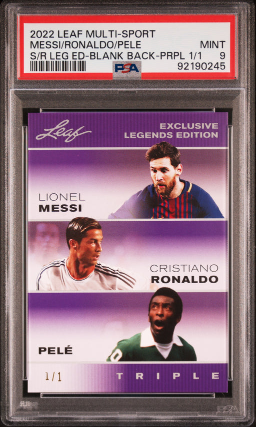 Gorgeous, PSA-graded 2022 Leaf Exclusives trading card of Soccer GOAT's Lionel Messi, Pele, and Cristiano Ronaldo. Better yet, this is a PSA MINT 9...