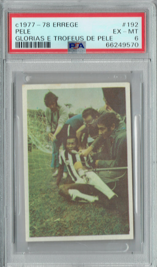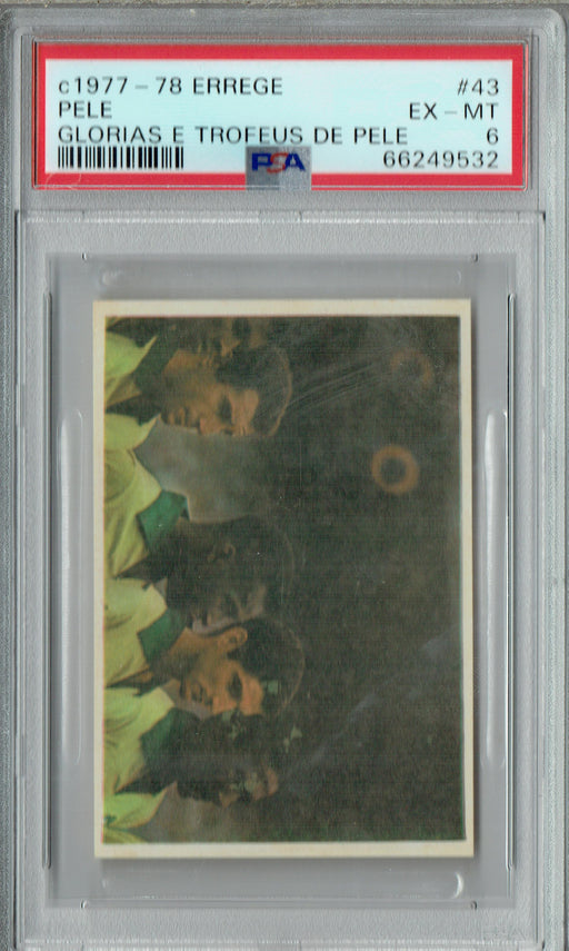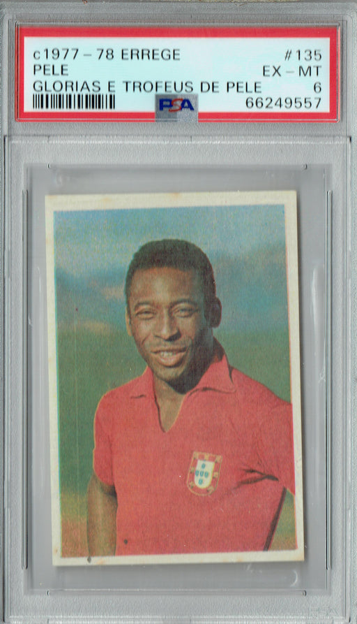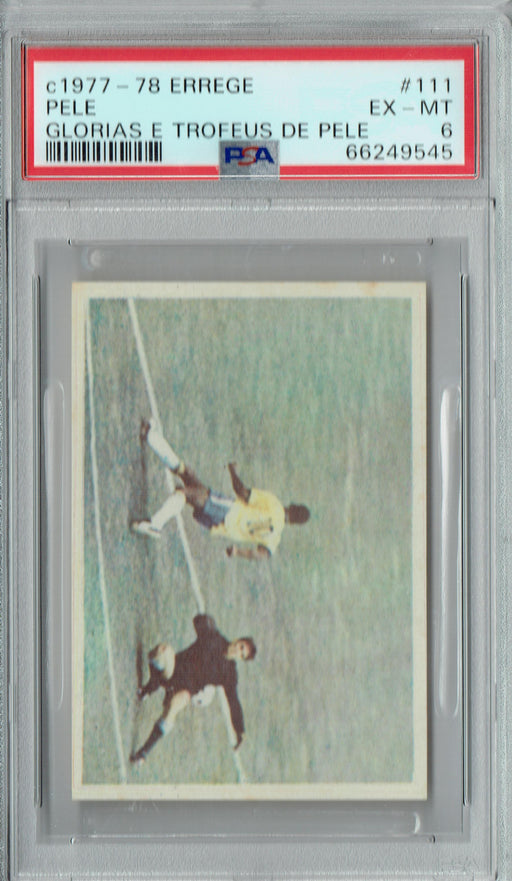 Gorgeous, PSA-graded 1977 Errege trading card of Pele of the Brazil. This is a PSA EX-MT 6 (Excellent-Mint) collectible card. This card is protecte...