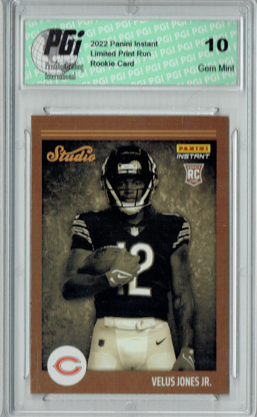 Gorgeous 2022 Panini Studio rookie card of Velus Jones Jr. . This card has been graded by Pristine Grading International (PGI), a leading grader of...