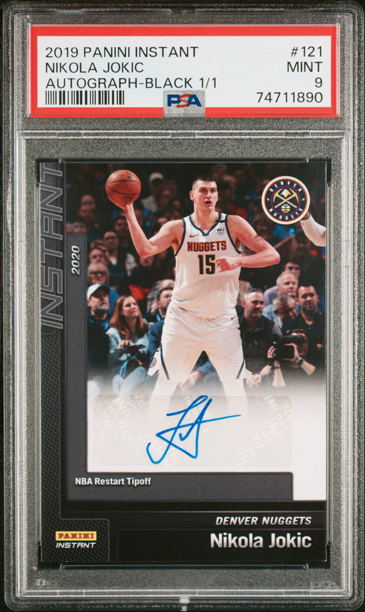 Gorgeous, PSA-graded 2019 Panini Instant trading card of Nikola Jokic of the Denver Nuggets. Super rare Black Masterpiece 1 of 1 Autograph. This is...