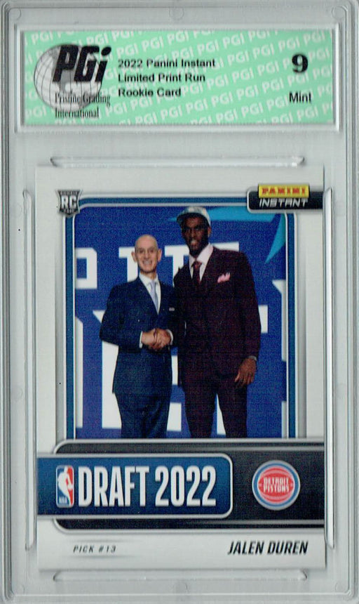 Gorgeous 2022 Panini Instant rookie card of Jalen Duren. This card has been graded by Pristine Grading International (PGI), a leading grader of tra...
