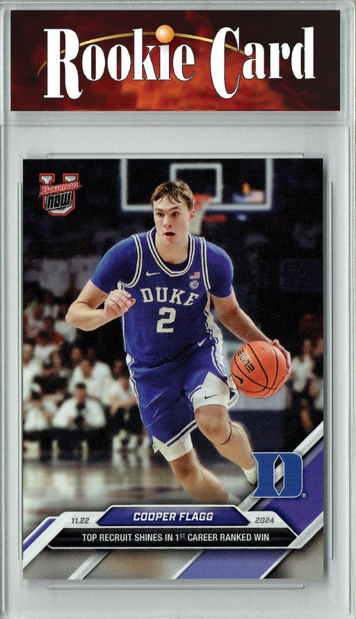 Gorgeous, exclusive 2024 Bowman University Now rookie card of Cooper Flagg of the Duke Blue Devils. Flagg is one of the brightest prospects in bask...