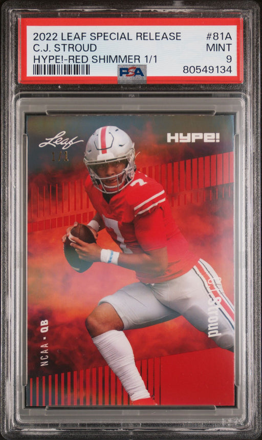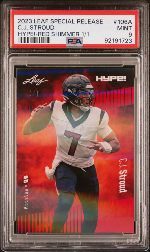 Gorgeous, PSA-graded 2022 Leaf Hype! trading card of C.J. Stroud of the Houston Texans. This is a PSA MINT 9 (Mint) Orange Shimmer 1 of 1. This car...