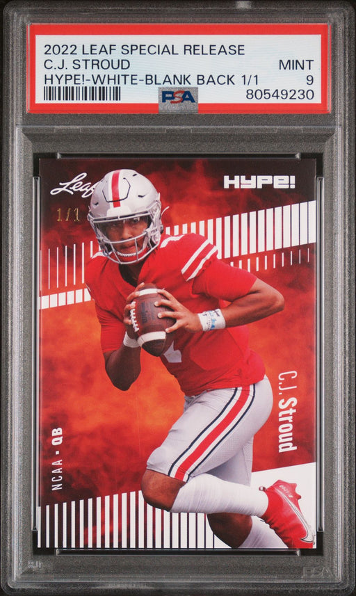 Gorgeous, PSA-graded 2022 Leaf Hype! trading card of C.J. Stroud of the Houston Texans. This is a PSA MINT 9 (Mint) Orange Blank Back 1 of 1. This ...
