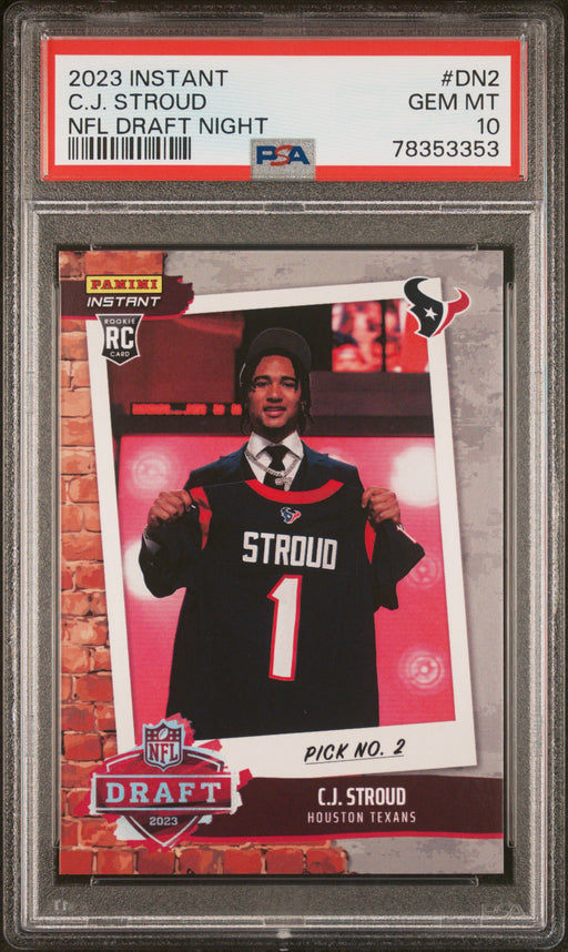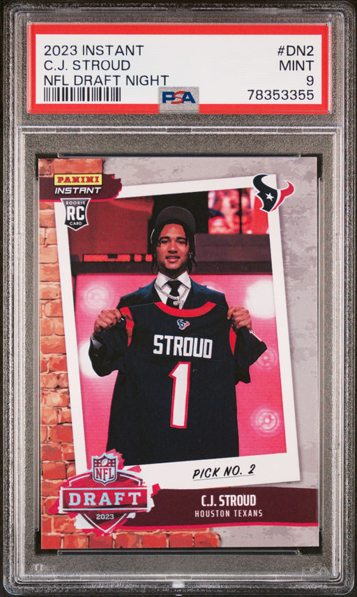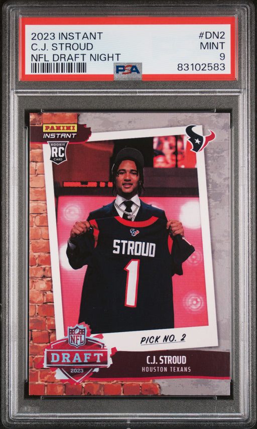 Gorgeous, PSA-graded 2023 Panini Instant trading card of C.J. Stroud of the Houston Texans. This is a PSA MINT 9 (Mint) collectible card. This card...