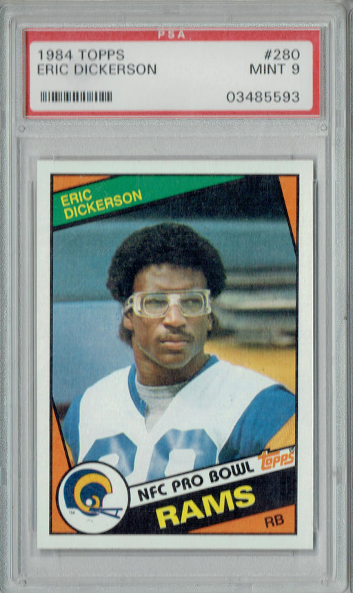 Gorgeous, PSA-graded 1984 Topps trading card of Eric Dickerson of the Los Angeles Rams. This is a PSA MINT 9 (Mint) collectible card. This card is ...