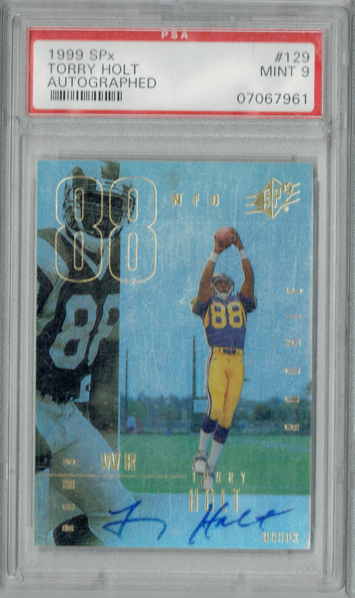 Gorgeous, PSA-graded 1999 Upper Deck SPx trading card of Torry Holt of the Los Angeles Rams. This is a PSA MINT 9 (Mint) collectible card. This car...