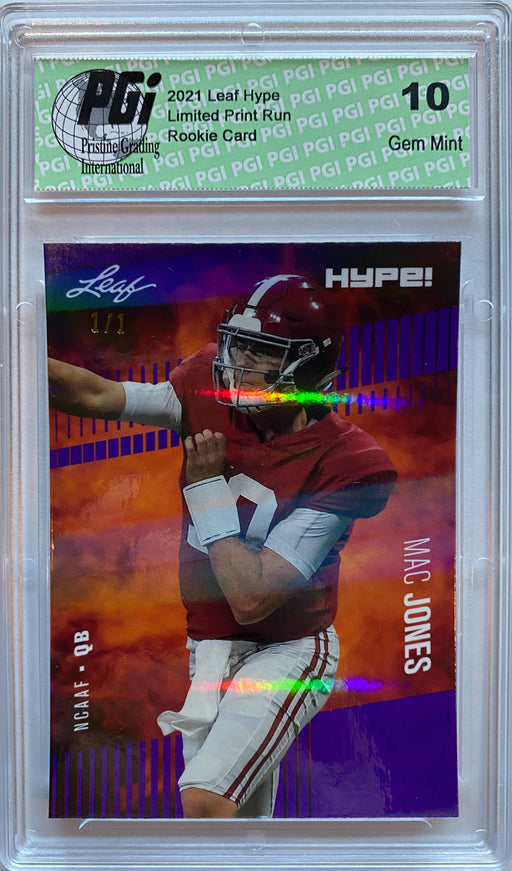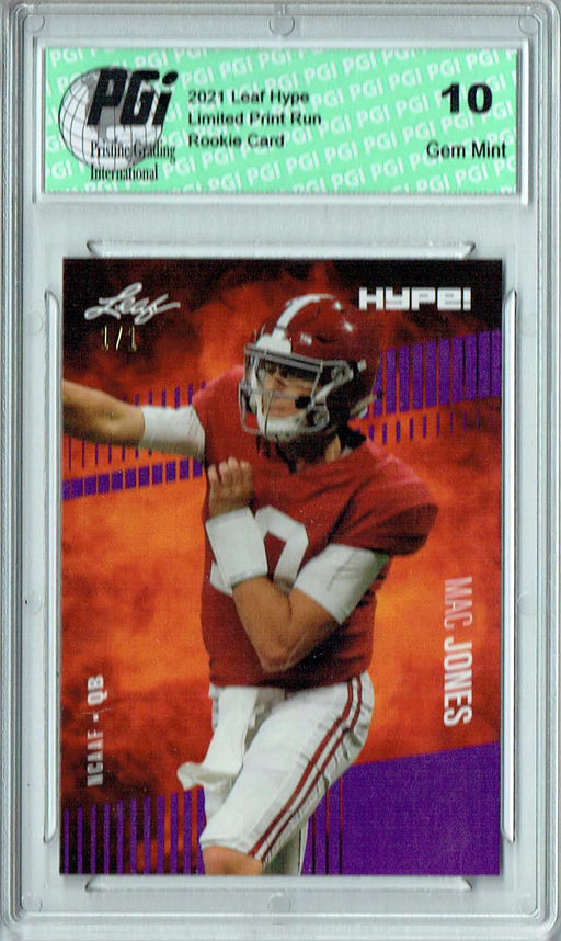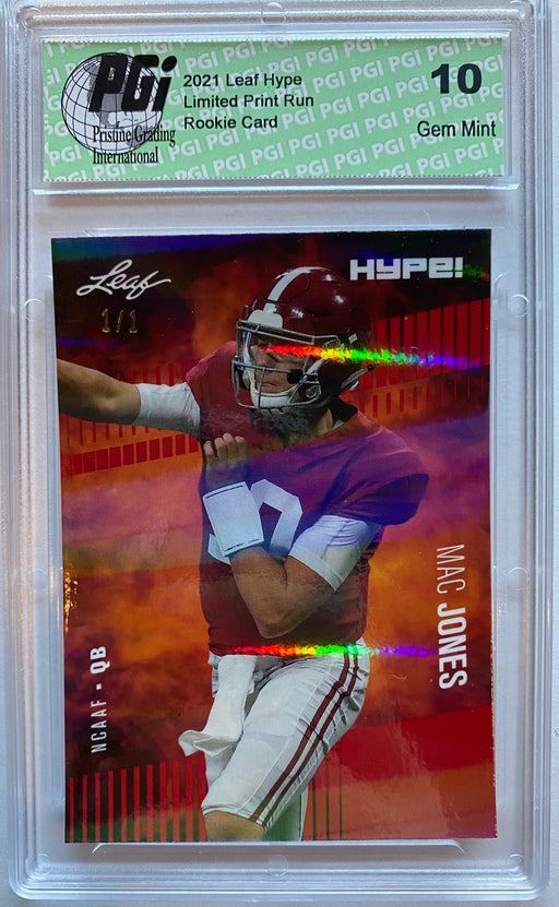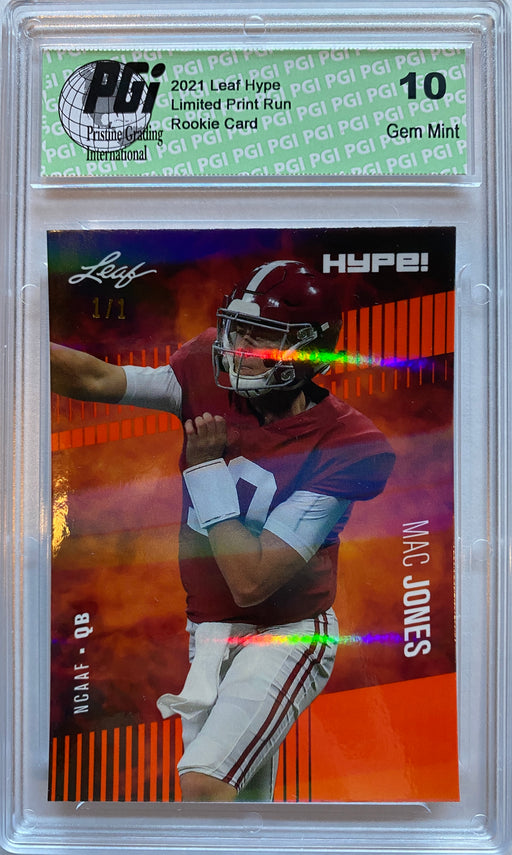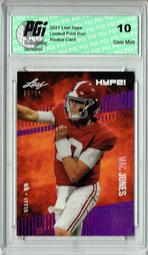 Gorgeous 2021 Leaf HYPE! rookie card of Mac Jones. This card has been graded by Pristine Grading International (PGI), a leading grader of trading c...