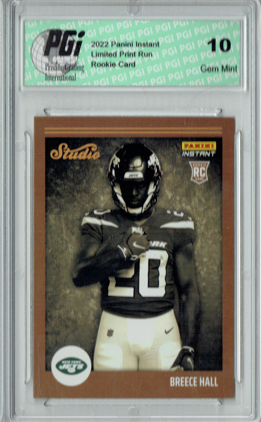 Gorgeous 2022 Panini Studio rookie card of Breece Hall . This card has been graded by Pristine Grading International (PGI), a leading grader of tra...