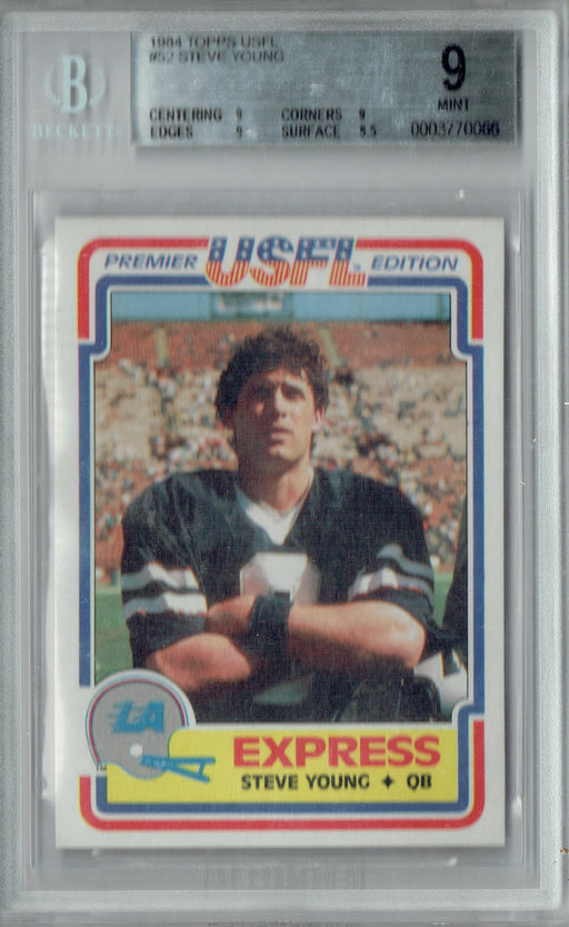 Gorgeous, Beckett-graded 1984 Topps USFL rookie card of Steve Young of the Tampa Bay Buccaneers. This is a BGS 9 Mint collectible card. This card i...