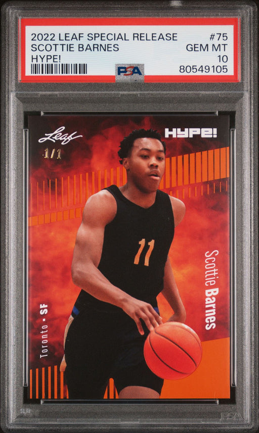 Gorgeous, PSA-graded 2022 Leaf Hype! trading card of Scottie Barnes of the Toronto Raptors. This is a PSA GEM-MT 10 (Gem Mint) collectible card. Th...