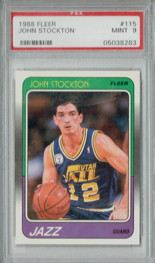 Gorgeous, PSA-graded 1988 Fleer trading card of John Stockton of the Utah Jazz. This is a PSA MINT 9 (Mint) collectible card. This card is protecte...
