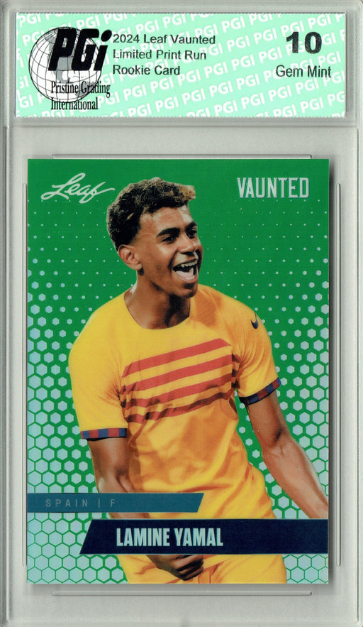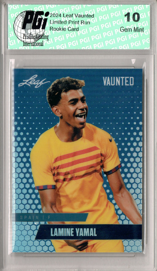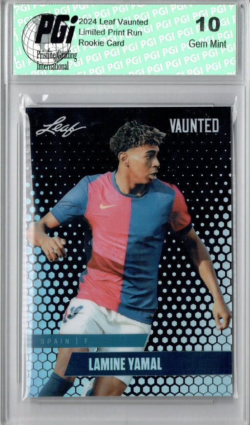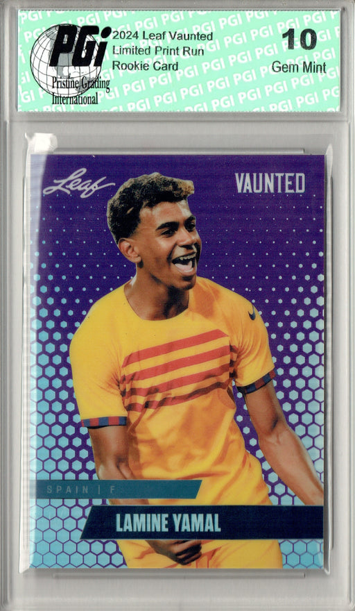 Gorgeous 2024 Leaf Vaunted Metal rookie card of Lamine Yamal from La Liga club Barcelona. This card has been graded by Pristine Grading Internation...
