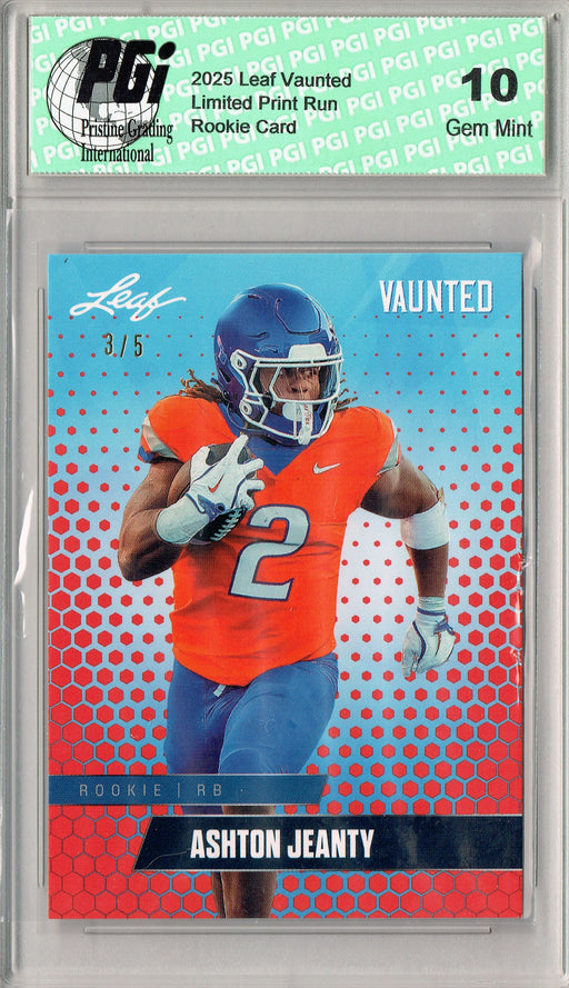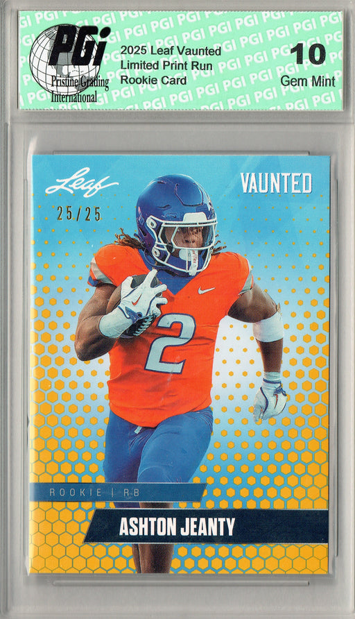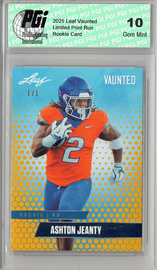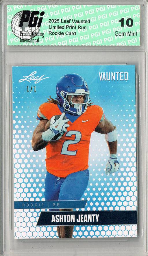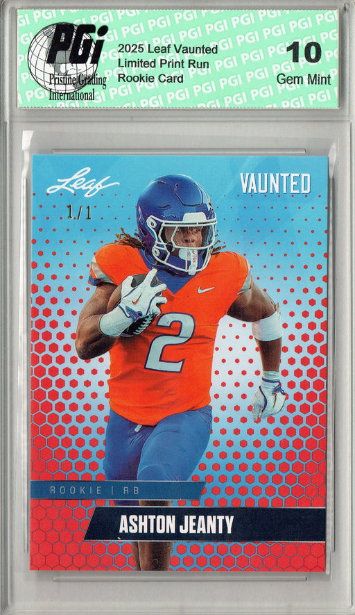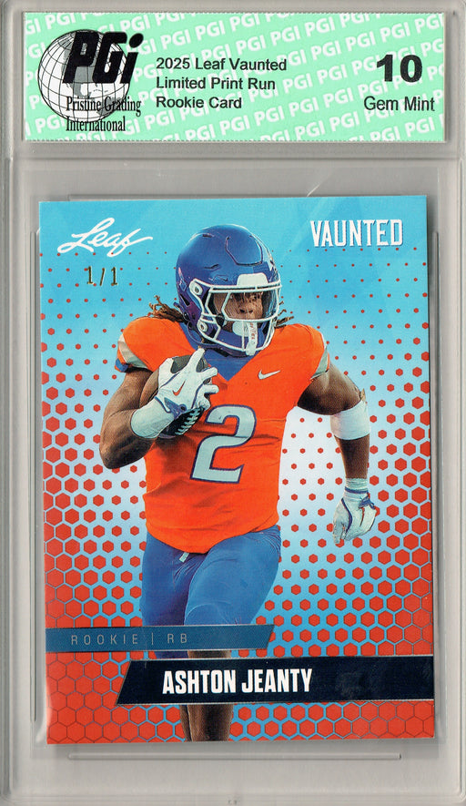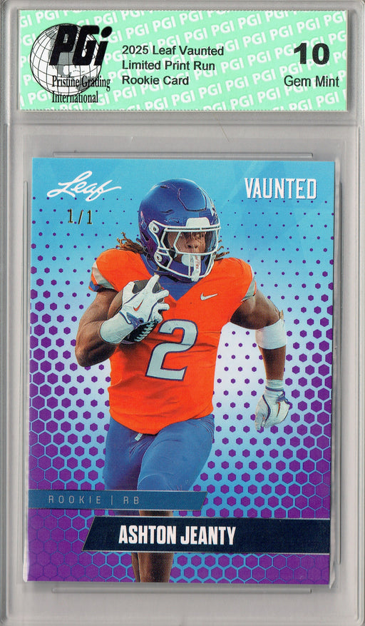 Gorgeous 2025 Leaf Vaunted rookie card of Ashton Jeanty of the Las Vegas Raiders. This card has been graded by Pristine Grading International (PGI)...