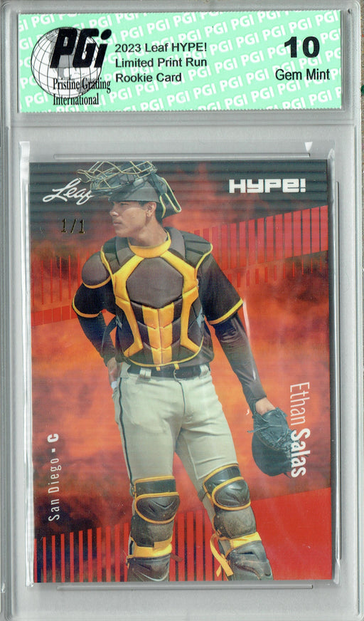 Gorgeous, PSA-graded 2023 Leaf Hype! trading card of Ethan Salas of the San Diego Padres. This is a PSA MINT 9 (Mint) collectible card. This card i...