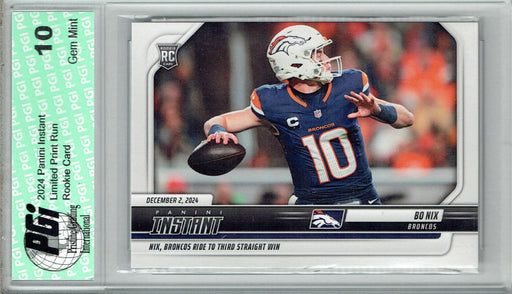 Gorgeous 2024 Panini Instant rookie card of Bo Nix of the Denver Broncos. This card has been graded by Pristine Grading International (PGI), a lead...