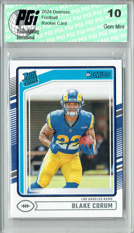 Gorgeous 2024 Donruss rookie card of Blake Corum of the Los Angeles Rams. This card has been graded by Pristine Grading International (PGI), a lead...