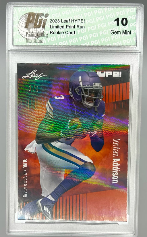 Gorgeous, PSA-graded 2023 Leaf Hype! trading card of Jordan Addison of the Minnesota Vikings. This is a PSA GEM-MT 10 (Gem Mint) collectible card. ...