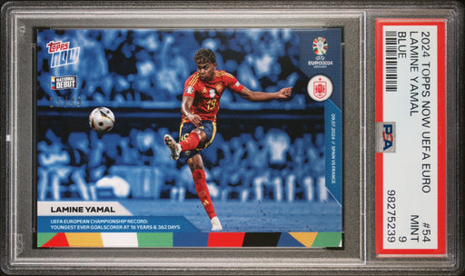 Gorgeous, PSA-graded 2024 Topps Now trading card of Lamine Yamal of the Spain. This is a PSA MINT 9 (Mint) collectible card. This card is protected...