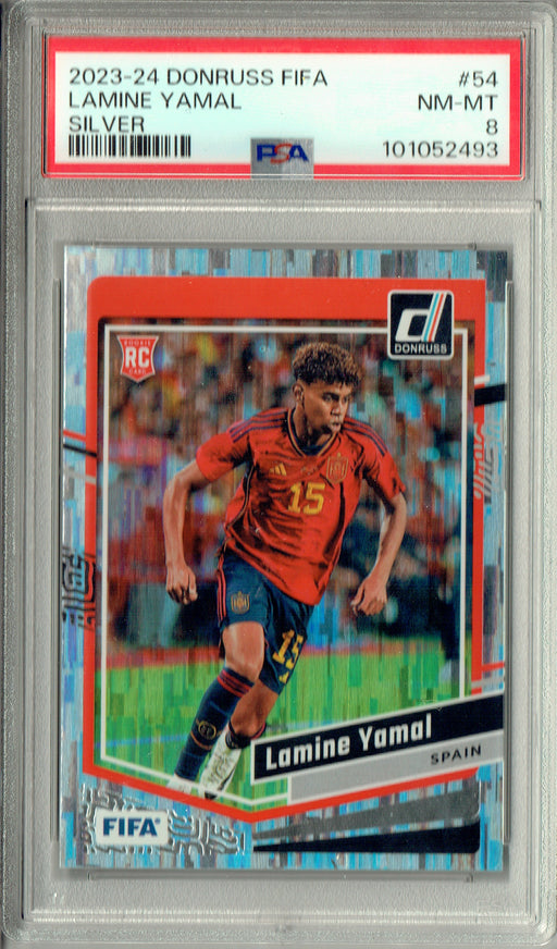 Gorgeous, PSA-graded 2023 Donruss FIFA rookie card of Lamine Yamal, soccer phenom from Barcelona. This is a PSA NM-MT 8 (Near Mint-Mint) collectibl...