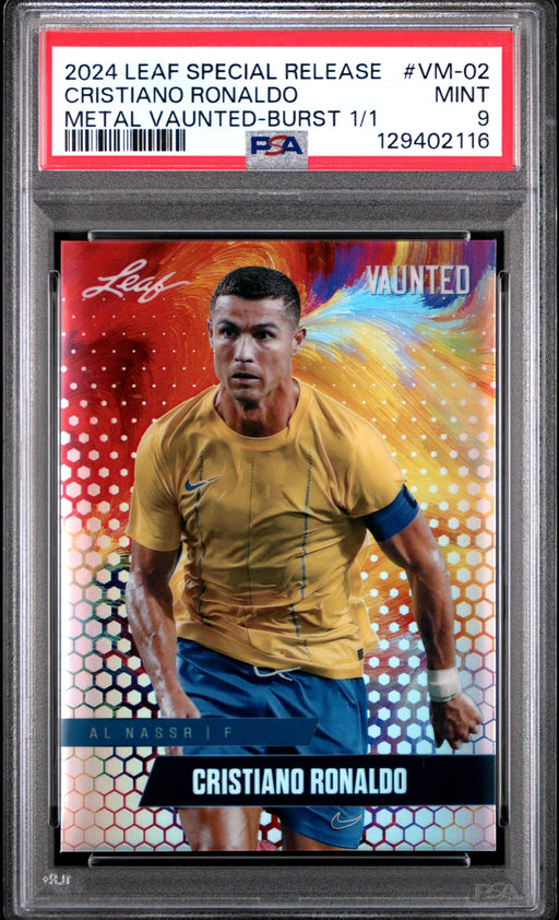 Gorgeous, PSA-graded 2024 Leaf Vaunted Metal trading card of Cristiano Ronaldo. This is a PSA MINT 9 (Mint) collectible card. This card is protecte...