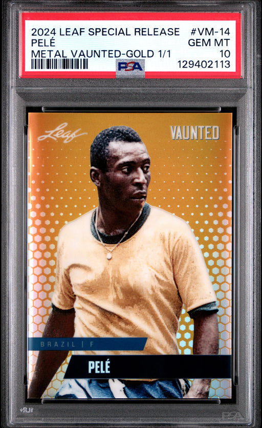 Gorgeous, PSA-graded 2024 Leaf Vaunted Metal trading card of global soccer icon Pele from Brazil. This is a PSA GEM-MT 10 (Gem Mint) collectible ca...