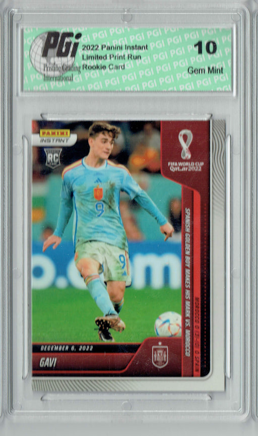 Gorgeous 2022 Panini Instant rookie card of Gavi. This card has been graded by Pristine Grading International (PGI), a leading grader of trading ca...