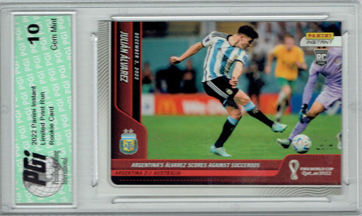 Gorgeous 2022 Panini Instant WORLD CUP rookie card of champion Julian Alvarez. This card has been graded by Pristine Grading International (PGI), a...