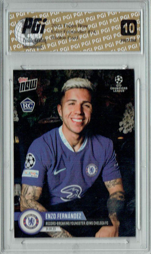 Gorgeous 2023 Topps Now rookie card of Enzo Fernandez. This card has been graded by Pristine Grading International (PGI), a leading grader of tradi...