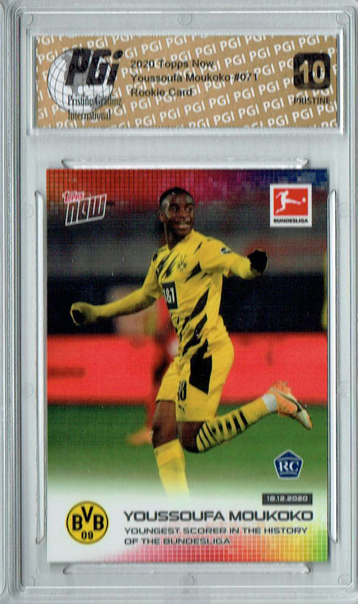 Gorgeous 2020 Topps Now rookie card of Youssoufa Moukoko. This card has been graded by Pristine Grading International (PGI), a leading grader of tr...