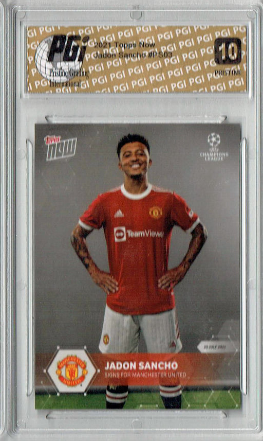 Fantastic, hard-to-find 2021 Topps Now card of Jadon Sancho. This card has been graded by Pristine Grading International (PGI), a leading grader of...