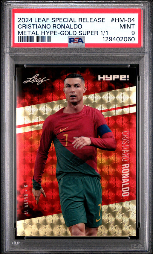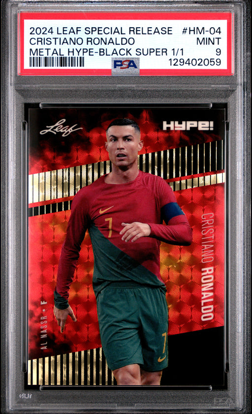 Gorgeous, PSA-graded 2024 Leaf HYPE! Metal trading card of Cristiano Ronaldo. This is a PSA MINT 9 (Mint) collectible card. This card is protected ...