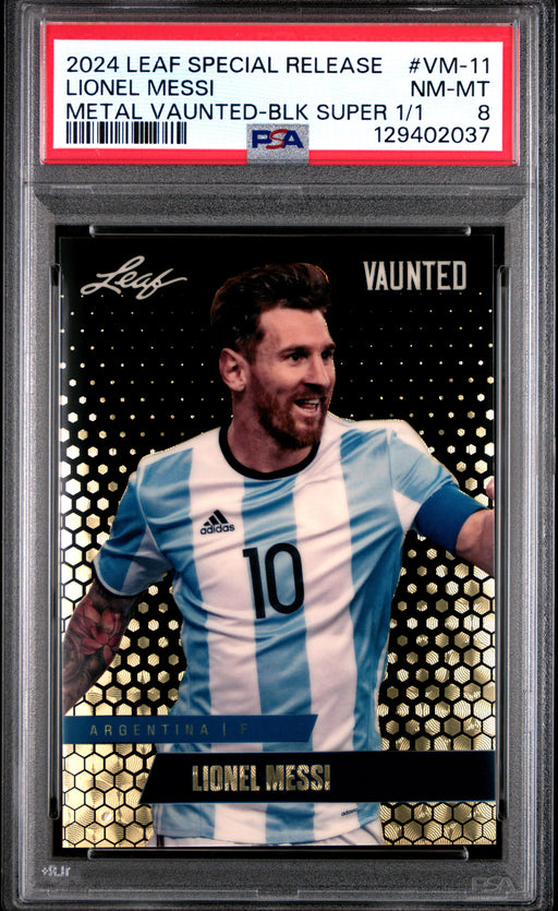 Gorgeous, PSA-graded 2024 Leaf Vaunted Metal trading card of global soccer icon Lionel Messi. This is a PSA NM-MT 8 (Near Mint-Mint) collectible ca...