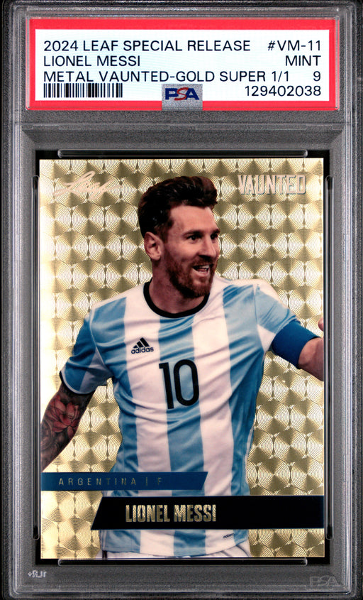Gorgeous, PSA-graded 2024 Leaf Vaunted Metal trading card of global soccer icon Lionel Messi from Argentina. This is a PSA MINT 9 (Mint) collectibl...