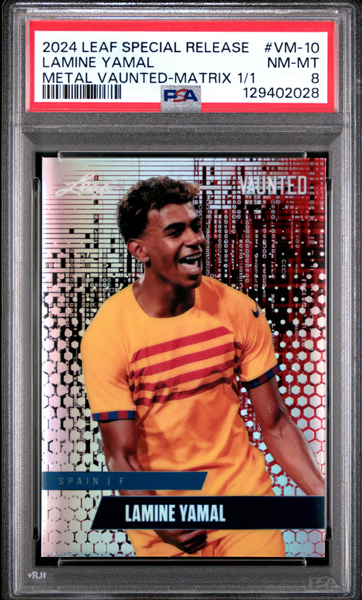 Gorgeous, PSA-graded 2024 Leaf Vaunted Metal rookie card of soccer's next big thing, Lamine Yamal from Spain. This is a PSA NM-MT 8 (Near Mint-Mint...