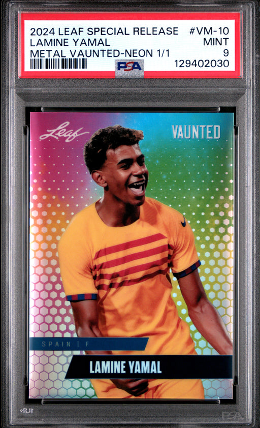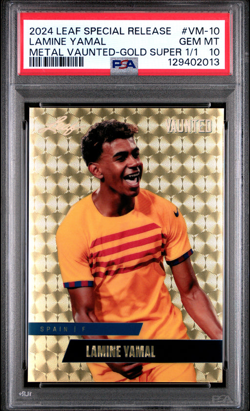 Gorgeous, PSA-graded 2024 Leaf Vaunted Metal rookie card of soccer's next big thing, Lamine Yamal from Spain. This is it, the Gold Superprismatic 1...