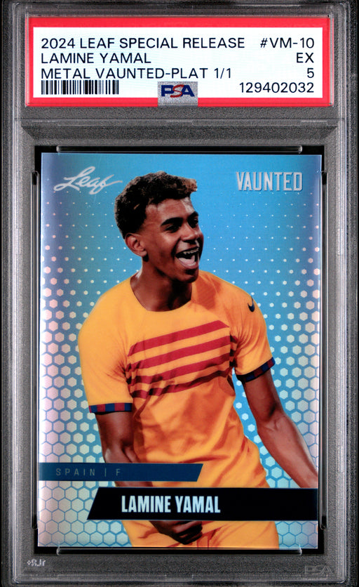 Gorgeous, PSA-graded 2024 Leaf Vaunted Metal rookie card of soccer's next big thing, Lamine Yamal from Spain. This is a PSA EX 5 (Excellent) collec...