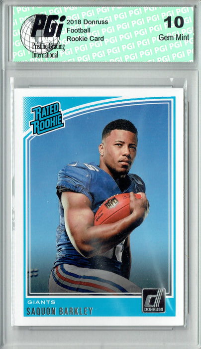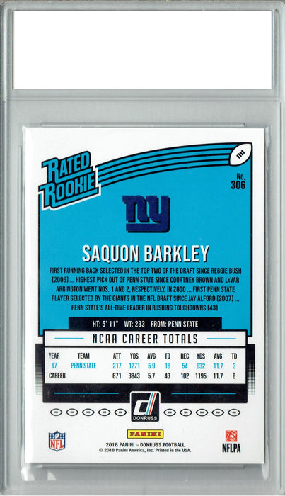 Gorgeous PGI 2018 Donruss Football card of Saquon Barkley. Keep in mind that Barkley didn't do any cards with Leaf, Sage, etc. so the amount of rookies available for him are far less than other high draft picks. Grading provides buyers with the peace of mind knowing they have a card in mint condition and that the protective graded holder will keep the card safe in the mail and in your possession. Please search our other listings for more great cards of this great athlete!